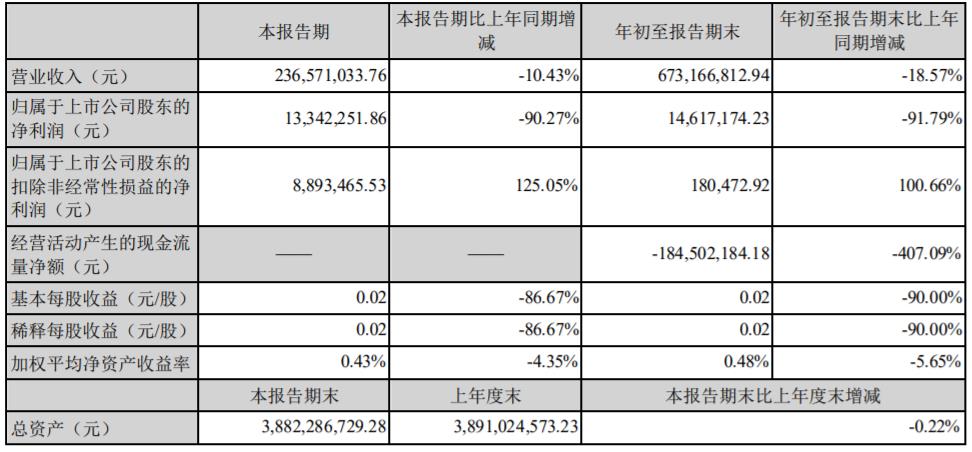 第三季度,盛路通信实现营收2.37亿元,同比下降10.43%;实现归属于上市公司股东的净利润1334.23万元,同比下降90.27%;实现扣非归母净利润889.35万元,同比增长125.05%。