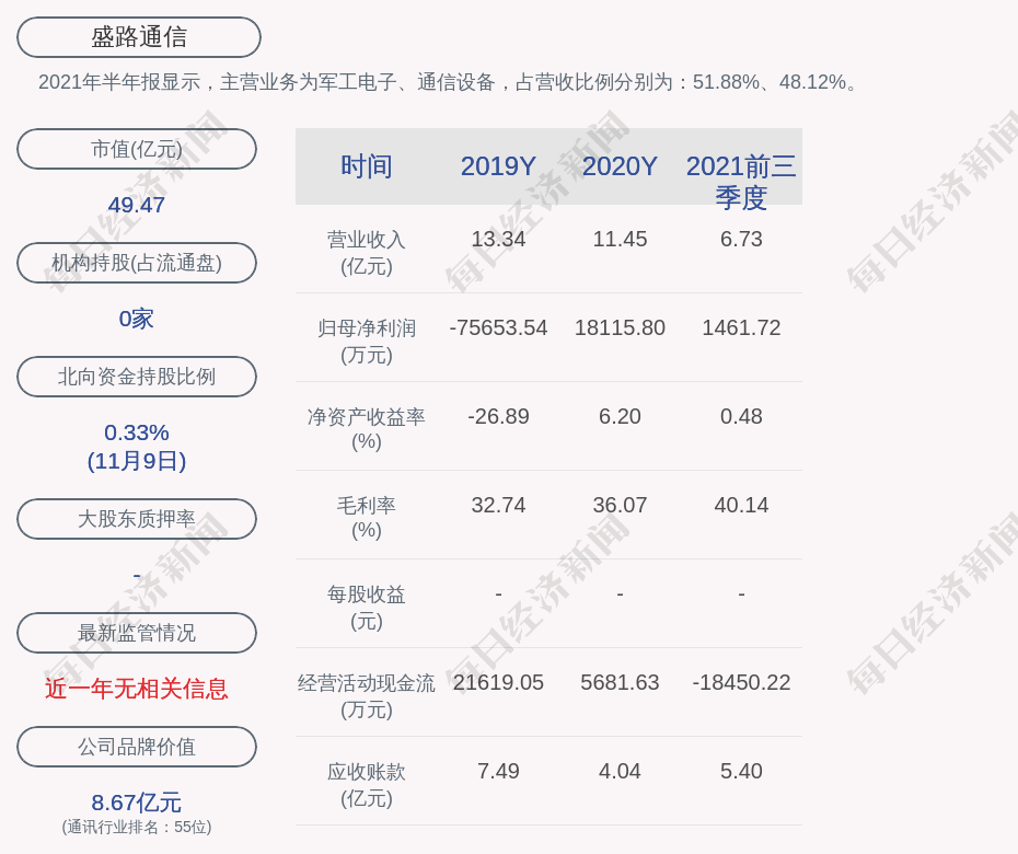 2021年半年报显示,盛路通信的主营业务为军工电子、通信设备,占营收比例分别为:51.88%、48.12%。