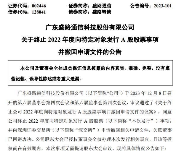 中国经济网北京12月11日讯盛路通信(002446.SZ)12月8日晚披露《关于终止2022年度向特定对象发行A股股票事项并撤回申请文件的公告》。