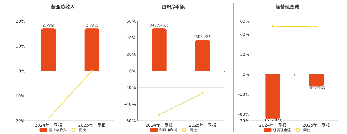 公司营业总收入为2.79亿元,较去年同报告期营业总收入减少14.23万元,同比较去年同期下降0.05%。归母净利润为2507.72万元,较去年同报告期归母净利润减少929.74万元,同比较去年同期下降27.05%。经营活动现金净流入为-465.56万元。