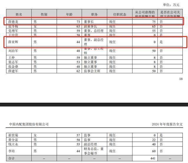 在高管薪酬方面,中原内配2024年董事、监事和高级管理人员的报酬合计为441万元。其中,时任董事长薛德龙以75万元的年薪位列公司薪酬榜首。