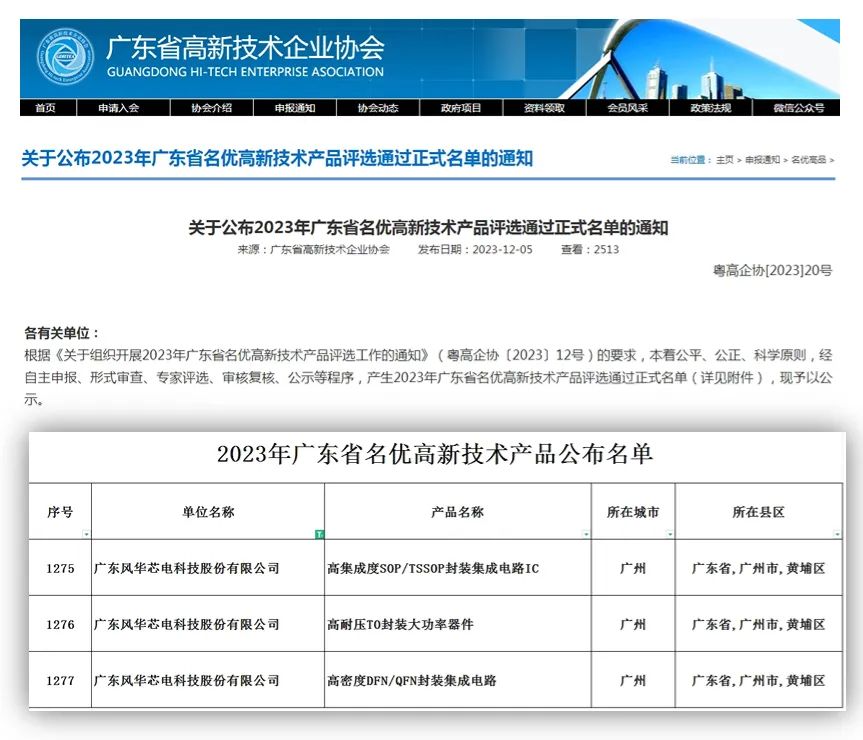 近日,广东省高新技术企业协会网发布《关于公布2023年广东省名优高新技术产品评选通过正式名单的通知》,国星光电子公司风华芯电申报的“高集成度SOP/TSSOP封装集成电路IC”“高耐压T0封装大功率器件”“高密度DFN/QFN封装集成电路”三项产品成功荣获“2023年广东省名优高新技术产品”称号,为公司科技创新工作再添佳绩。