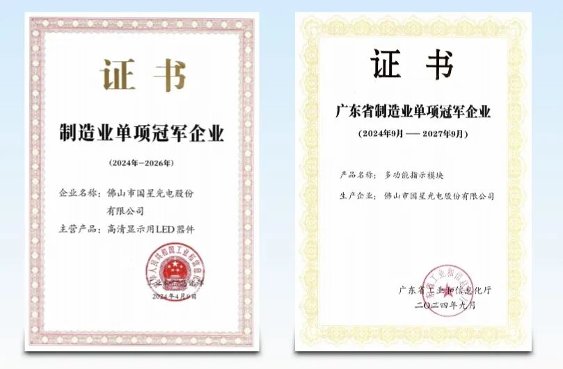 ▲今年,国星光电先后荣获国家级、省级制造业单项冠军企业荣誉称号