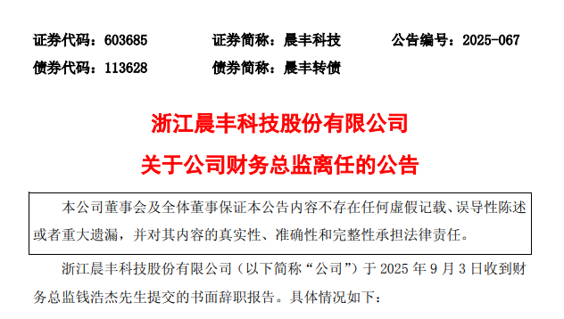 晨丰科技:财务总监钱浩杰离任