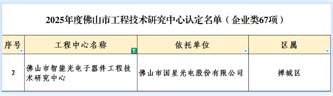9月3日,佛山市科技局公布2025年度工程技术研究中心名单,国星光电组建的“智能光电子器件工程技术研究中心”顺利上榜。