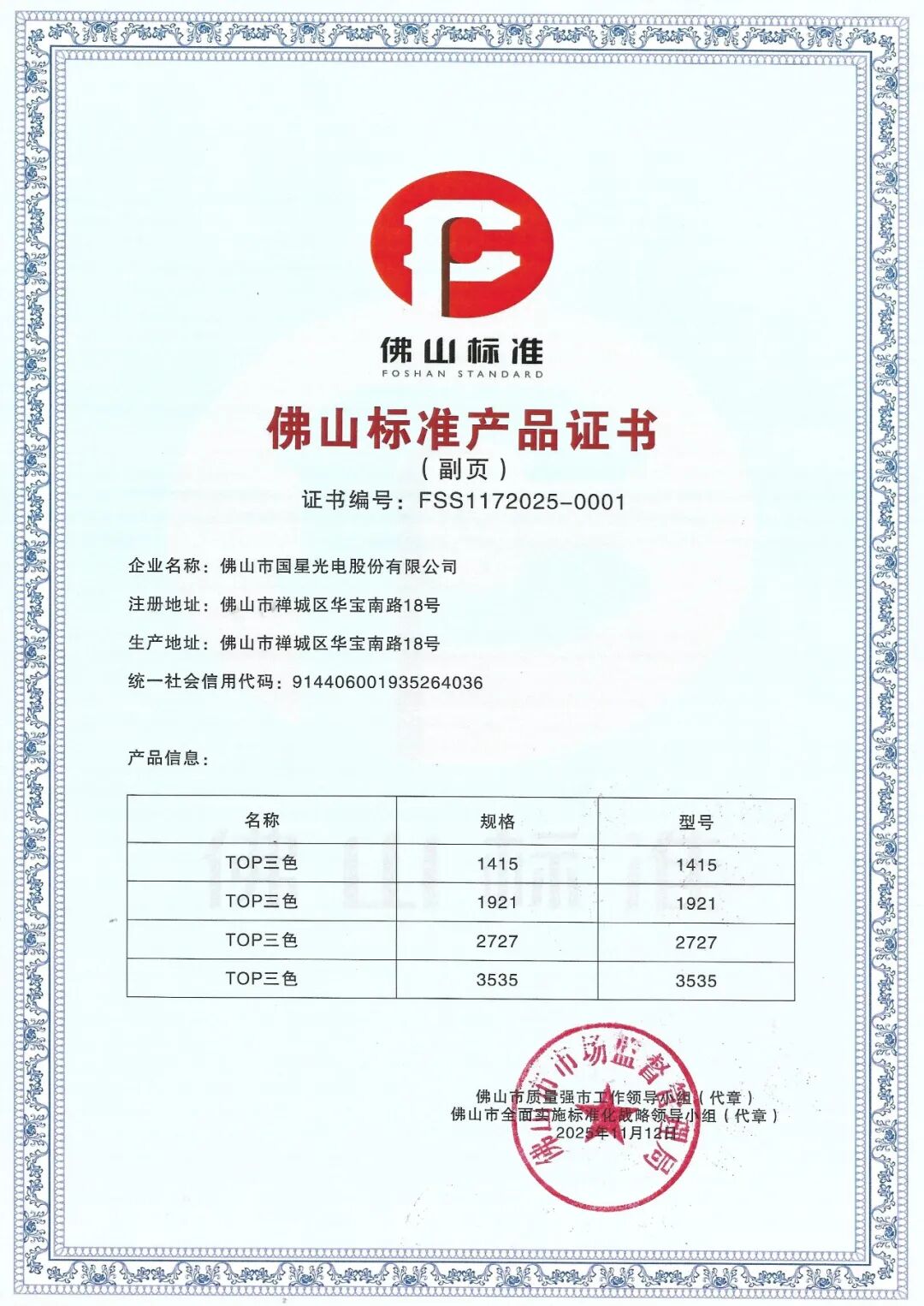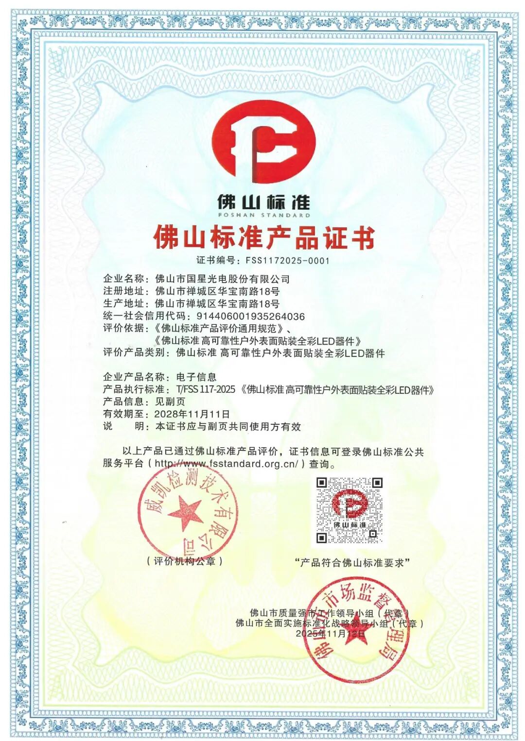 近日, 佛山市市场监督管理局 发布2025年佛山标准产品评价结果, 国星光电 申报的“高可靠性户外表面贴装全彩LED器件”成功上榜,获评“佛山标准产品”。