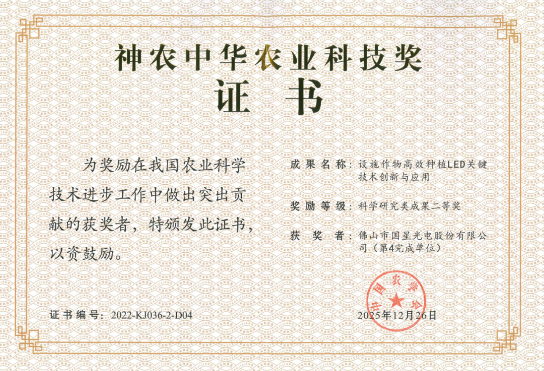 该奖项的获得,是国星光电以科技创新赋能农业新质生产力发展的重要成果,更是公司以实际行动助力农业农村现代化建设的具体实践。