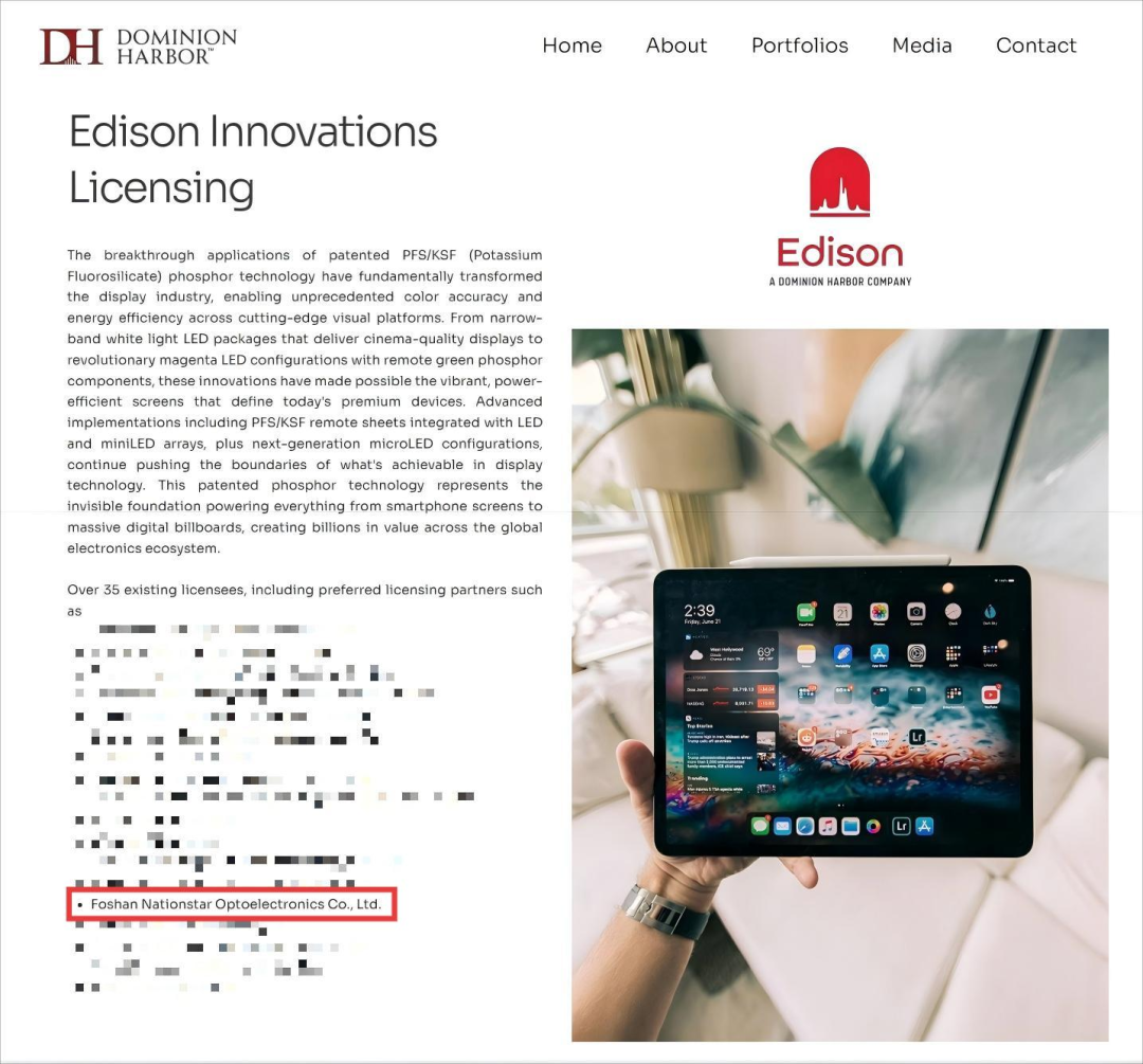 Edison的KSF显示背光技术专利组合源自Dolby Laboratories对GE Licensing业务的收购,经Dominion Harbor整合后形成。本次授权的达成,标志着国星光电对显示背光专利格局的深刻理解与持续布局。