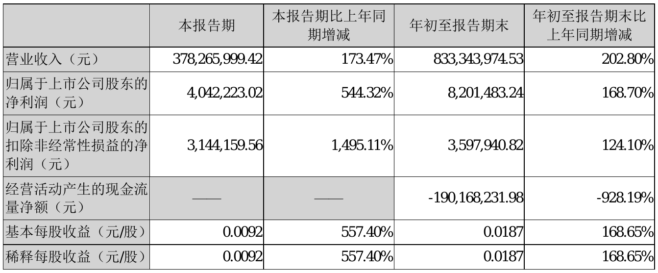 摩恩电气(002451)近日发布2021年前三季度报告,报告期内营业收入833,343,974.53元,同比增加202.80%;净利8,201,483.24元,同比净利增加168.70%。