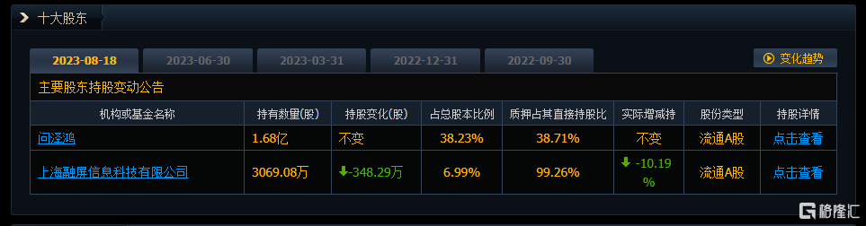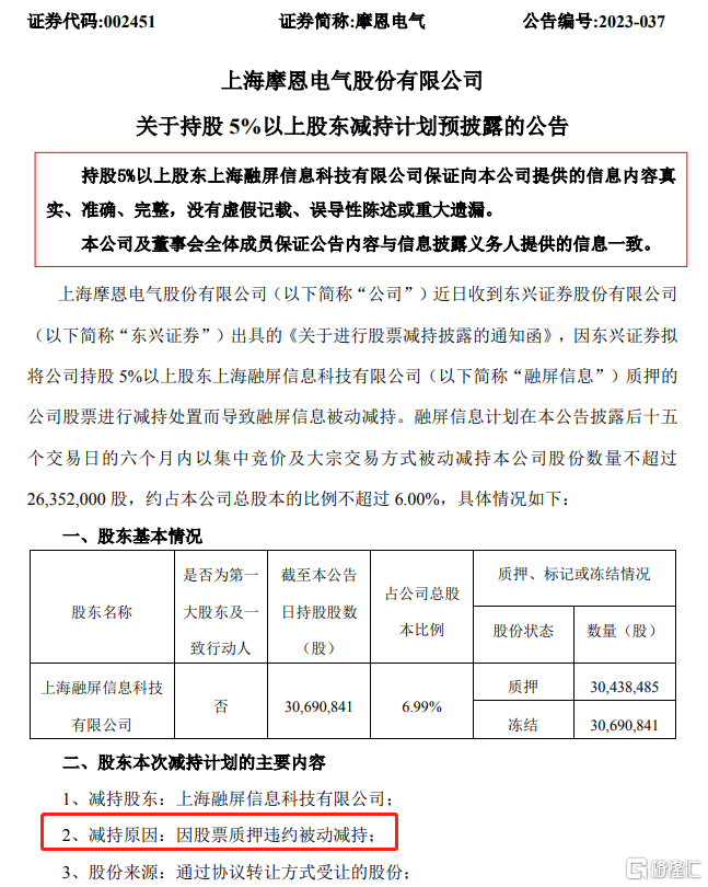 截至公告日,融屏信息持有摩恩电气3069.08万股,占公司总股本的6.99%;其中,3043.85万股被质押,3069.08万股处于冻结状态。