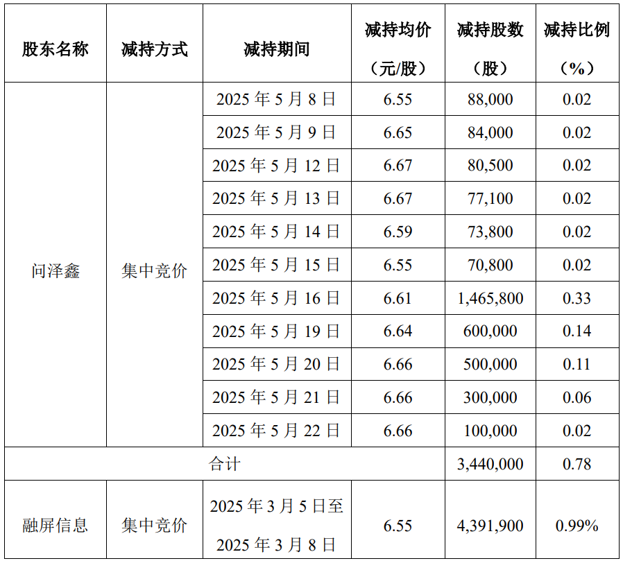 减持主体二(持股5%以上股东):持有公司股份30,438,485股(占公司总股本比例6.99%)的股东融屏信息因东兴证券拟将其质押的公司股票进行减持处置而导致被动减持。融屏信息计划在2025年2月28日至2025年5月27日期间,以集中竞价及大宗交易方式被动减持公司股份数量不超过13,176,000股,约占公司总股本的比例不超过3%,其中以集中竞价方式减持公司股份数量不超过公司总股本的1%;以大宗交易方式减持公司股份数量不超过公司总股本的2%。