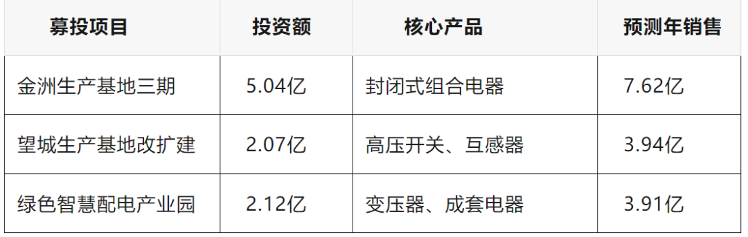 公司本次募集资金8.56亿元主要投向高压开关、封闭式组合电器、成套电器、互感器、变压器以及一二次融合设备等产品,募投项目建设达产后,相关产品的产能将实现较大幅度增长。