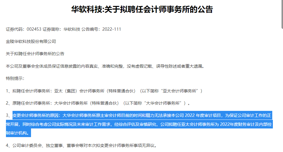 公司公告称,变更会计师事务所的原因为:大华会计师事务所原主审会计师目前的时间和精力无法承接本公司 2022 年度审计项目。