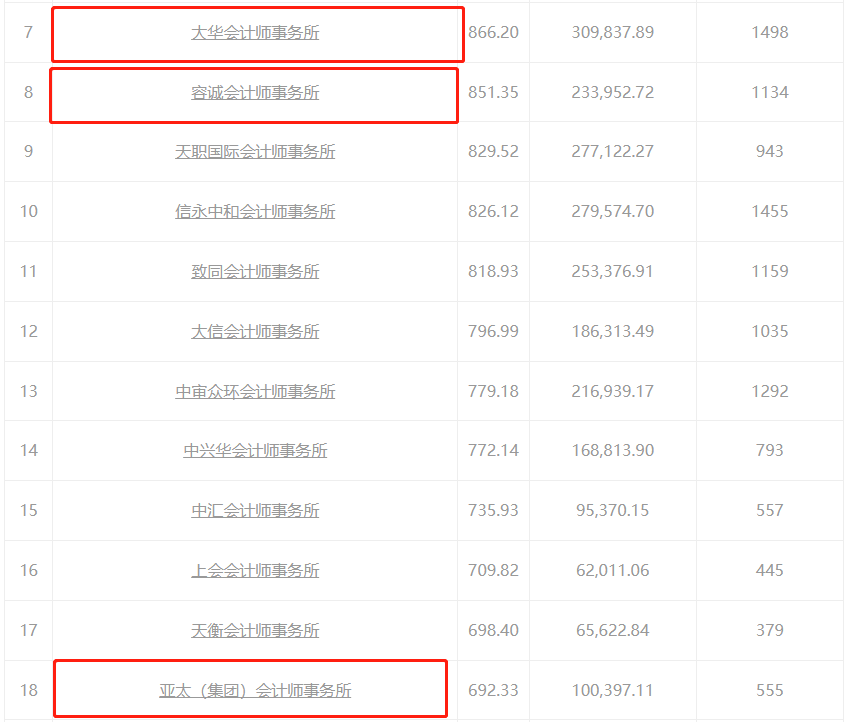 另据公开资料显示,去年9月,中国注册会计师协会发布了《2021年度会计师事务所综合评价百家排名信息》。其中大华会计师事务所位列第7、容诚会计师事务所位列第8,而亚太(集团)会计师事务所位列18。