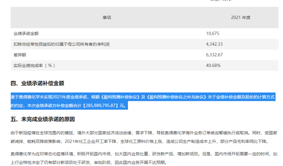 然而到了2021年度,经大华会计师事务所(特殊普通合伙)审计,奥得赛化学2021年实现的合并报表口径下扣除非经常性损益后的归属于母公司所有者的净利润为4342.33万元,未实现《盈利预测补偿协议》及《盈利预测补偿协议之补充协议》中2021年度的业绩承诺10675万元。