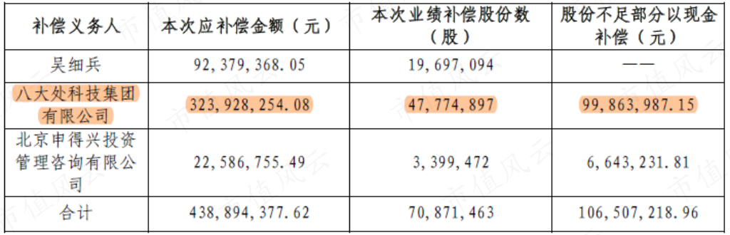 由于未完成业绩承诺,奥德赛原股东需进行业绩补偿。承担70%业绩补偿的八大处科技,目前因发行股份购买资产获得的股份不足以履行业绩承诺,还需补偿近亿元现金。