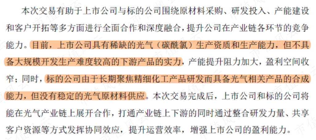 收购后双方可以在光气产业链上合作,打通上下游,整合研发力量,增强上市公司盈利能力。