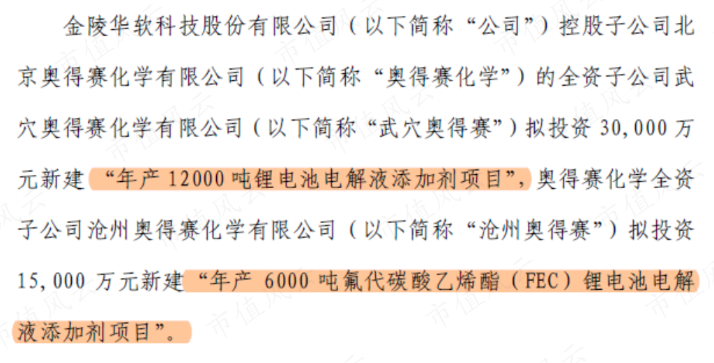 对于电子化学品业务,华软科技曾在2021年11月公告,投资建设下面两个锂电池电解液添加剂项目: