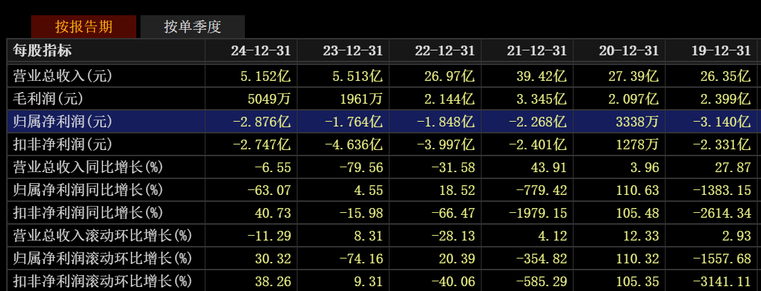 从2019年至2024年的六年间,华软科技只有在2020年实现了盈利。2021年至2024年,该公司营业收入分别为39.42亿元、26.97亿元、5.51亿元、5.15亿元,归母净利润分别亏损2.27亿元、1.85亿元、1.76亿元、2.88亿元,扣非净利润分别亏损2.4亿元、4亿元、4.64亿元、2.75亿元。