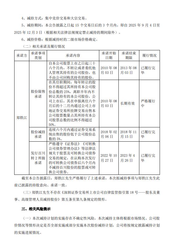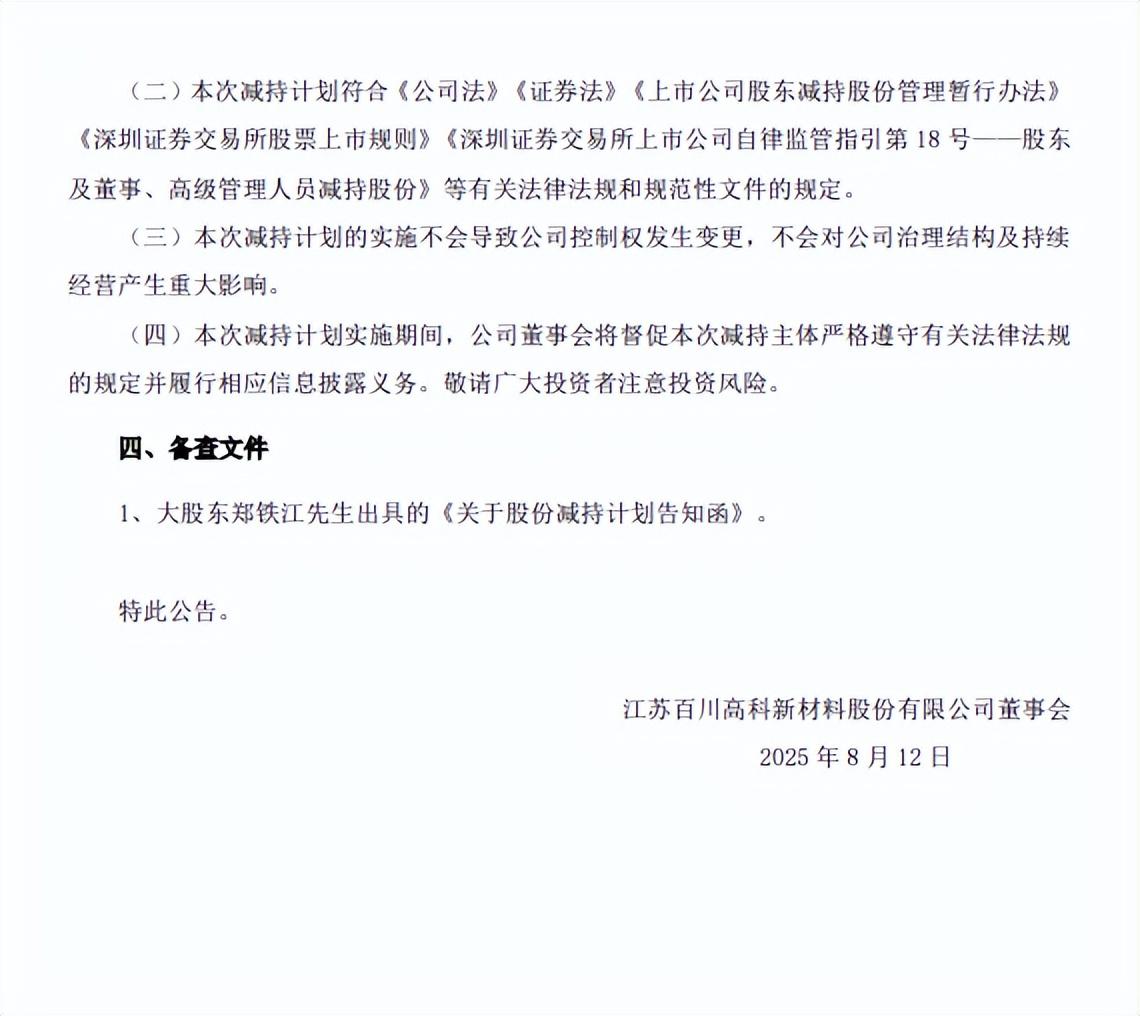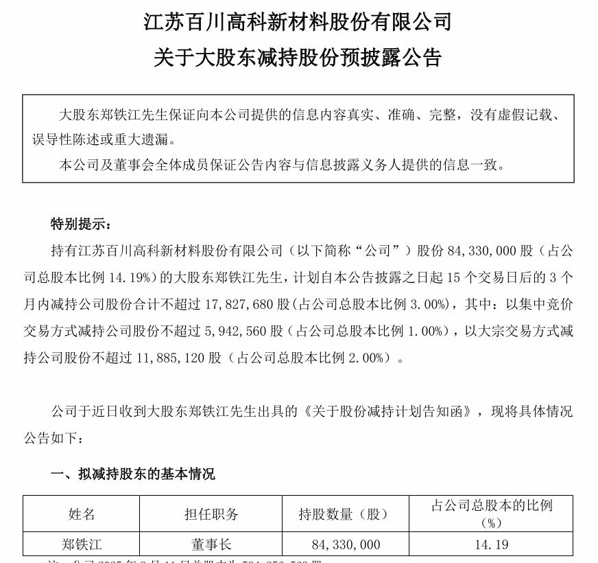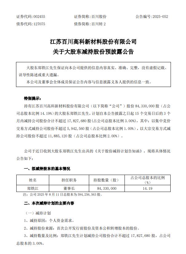 8月12日,百川股份(002455)发布公告,董事长郑铁江因个人资金需求,计划自2025年9月4日至2025年12月3日,通过集中竞价和大宗交易方式,减持不超过1783万股,占公司总股本的3%。