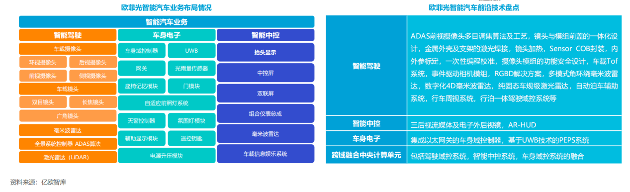 亿欧智库最新发布的《2022中国智能电动汽车前沿科技量产应用研究报告》指出,中国智能电动汽车智能网联领域前沿科技主要包括激光雷达、4D毫米波雷达、大算力车规级计算芯片、整车信息安全防护、XR拓展现实、L3级别自动驾驶和车路云一体化,涉及一径科技、欧菲光、地平线等企业。