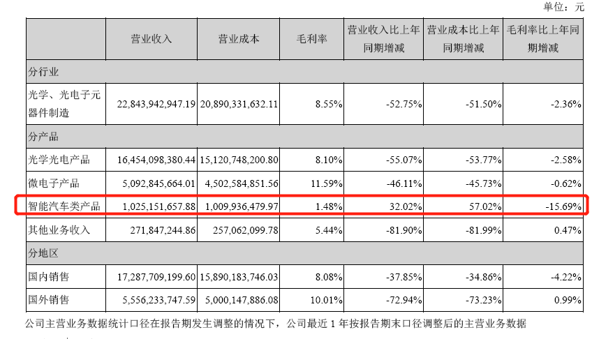 不过,虽然欧菲光大力投资多年的智能汽车业务营收已经实现了快速增长,但其占欧菲光总营业收入的比例还很小(2021年的营收占比仅有4.48%),同时该类产品的毛利率仅有1.48%。