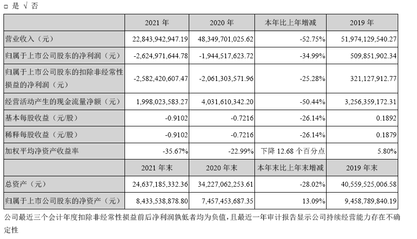 财报显示,2021年,欧菲光实现营业总收入228.44亿元,同比下降52.75%;净利润为亏损26.25亿元,这是欧菲光连续第二年出现较大幅度的亏损。早在2020年,欧菲光已经亏损了19.45亿元。