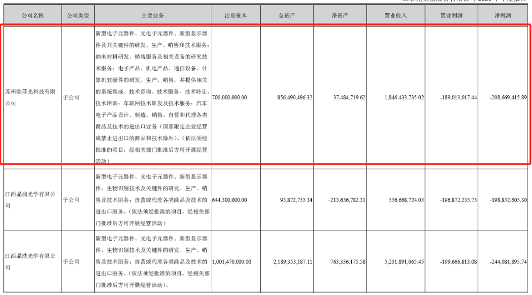如此看来,欧菲光的智能汽车业务很大程度上还处于亏损状态。资料显示,欧菲光的智能汽车业务主要由旗下苏州欧菲光科技、上海欧菲智能车联科技有限公司两大子公司负责。2021年,苏州欧菲光科技的营业收入是18.46亿元,净利润亏损了2.09亿元。