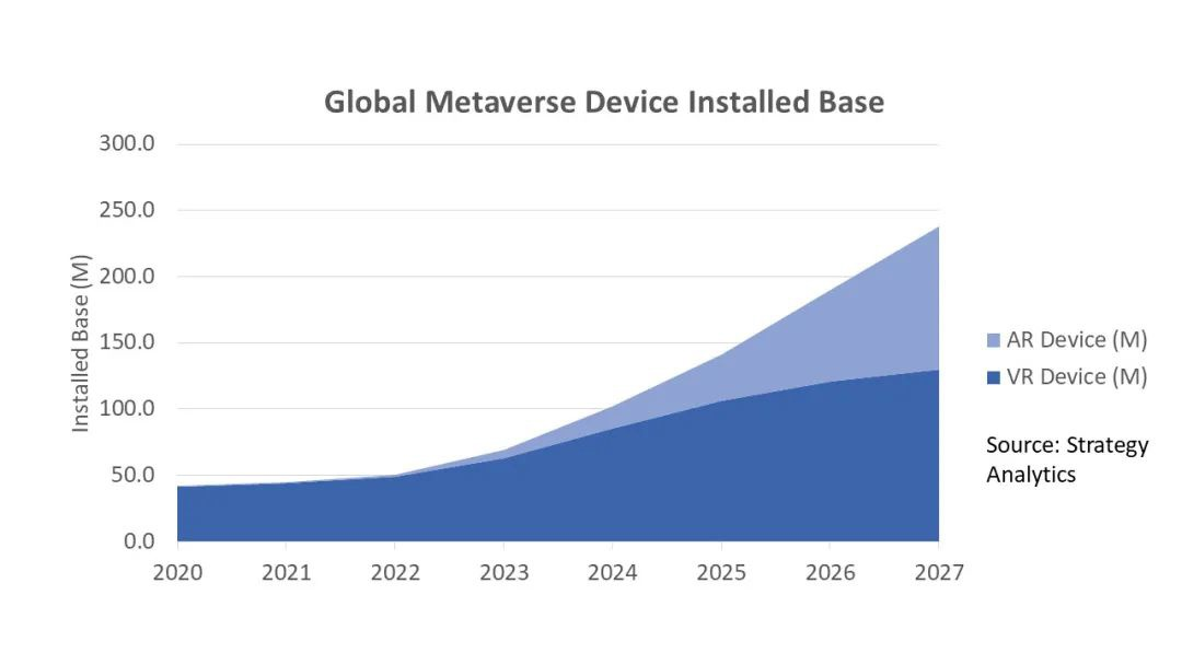 元宇宙的走红更是给VR/AR行业添了一把火。作为“元宇宙入口”,VR/AR有望成为新一代移动终端,市场前景广阔。市场研究机构Strategy Analytics最新报告指出,VR/AR设备随着元宇宙的投资增加,其产品出货量持续攀升,到2024年元宇宙设备的市场存量将达到1亿,不出几年将成为消费电子产品的销售主力军。