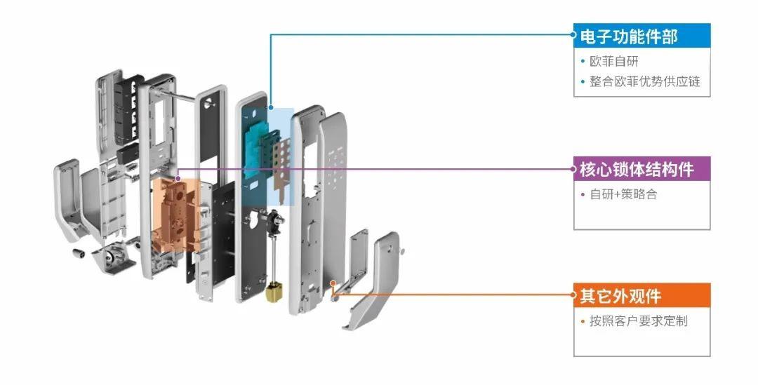 欧菲光表示,不再局限于智能门锁单一零部件的研发制造,以指纹识别、3D 感测及视觉方案为核心支撑,通过自研加策略合作的方式,同时整合集团优势产业链,从指纹模组、3D Sensor、猫眼、锁控板到 ID / CMF、整锁设计上提供一站式服务,打造智能门锁整机业务,进行整机研发设计和生产制造。