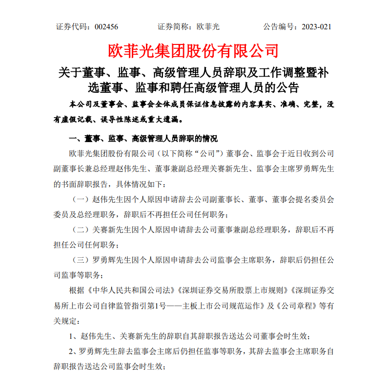 欧菲光3月1日晚间发布公告称,收到公司副董事长兼总经理赵伟先生、董事兼副总经理关赛新先生、监事会主席罗勇辉先生的书面辞职报告。三人均因个人原因辞职,其中,赵伟、关赛新辞职后不再担任公司任何职务,罗勇辉辞职后仍担任公司监事等职务。