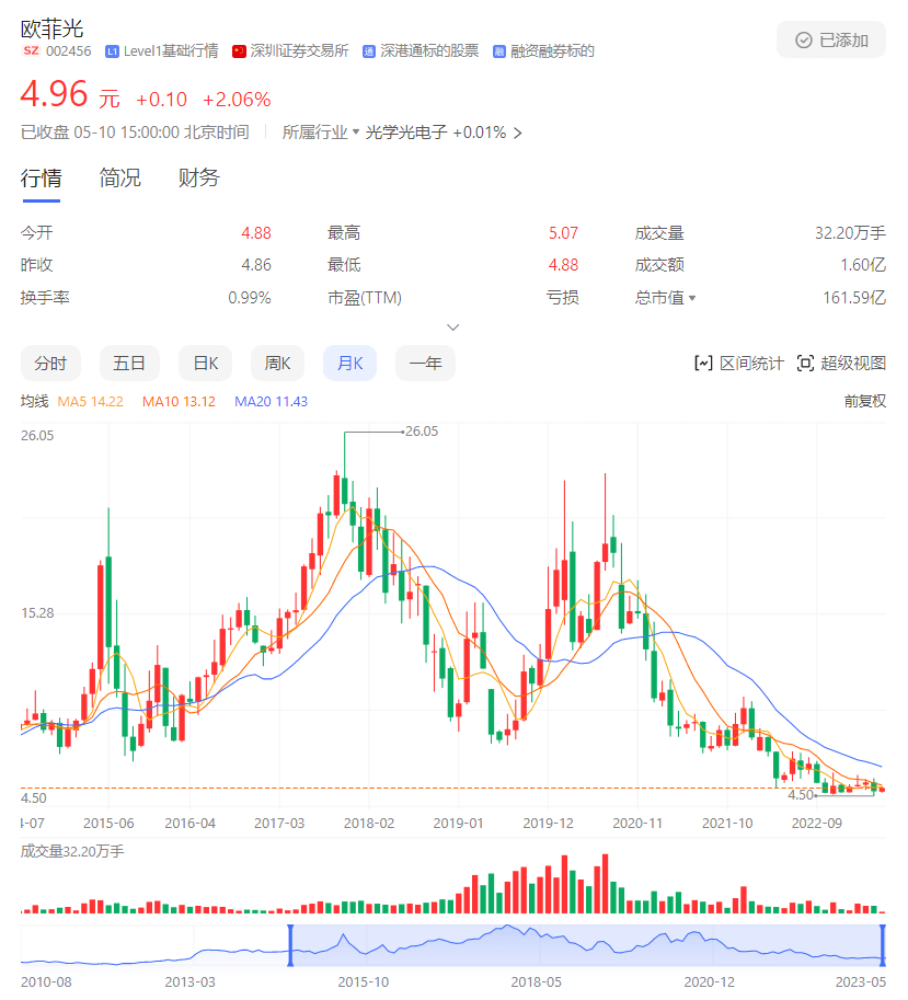当年作为火爆的苹果概念股,当时的欧菲光可谓是风光满面,但是,在苹果断链后,股价一路雪崩,在2020年7月14日的时候,当时的股价是23.63元每股,而如今截止到5余10日,仅剩下4.9元每股,股价已经跌去了近8成,而总市值也仅剩下160亿左右,相比起2020年7月的时候,已经蒸发掉了700元市值。