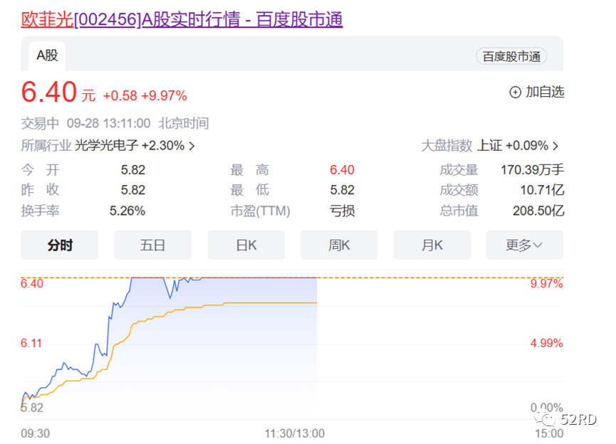 消息传出后,欧菲光股价大涨,盘中迎来涨停。