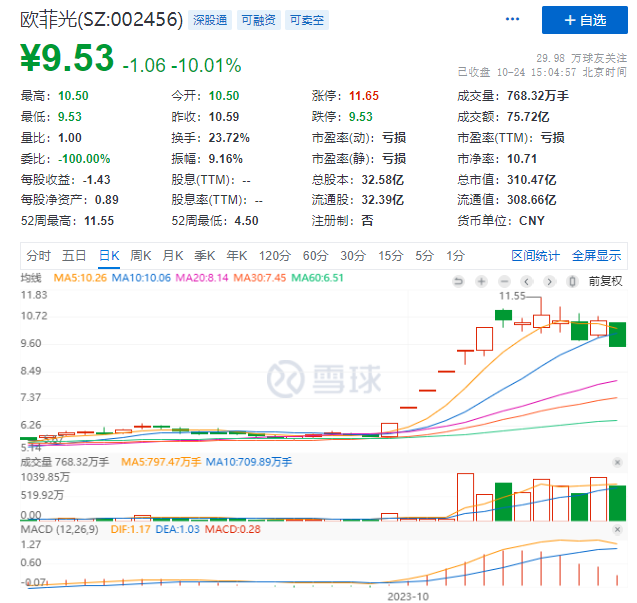 “红极一时”的欧菲光今日突然跌停,报9.53元/股。