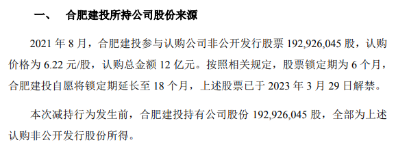 公告显示,合肥建投所持股份是在2021年8月参与定增买入,认购价格为 6.22 元/股,认购总金额 12 亿元,减持原因是“自身资金统筹及业务发展需要”。