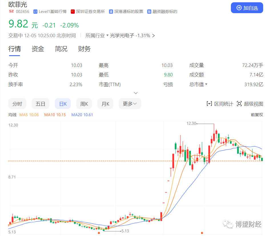 调研机构TechInsights曾预计,整个Mate60系列在其生命周期内的出货量预计将达到500万至600万部,可能会给欧菲光带来不菲的收入。在Mate60的舆论热潮里,跟华为沾边的A股公司普遍迎来上涨,欧菲光成了最大的赢家,连续6个交易日收获涨停板,最高涨幅接近翻倍。截至发稿前,欧菲光股价处于9.8元/股左右,略有回调。