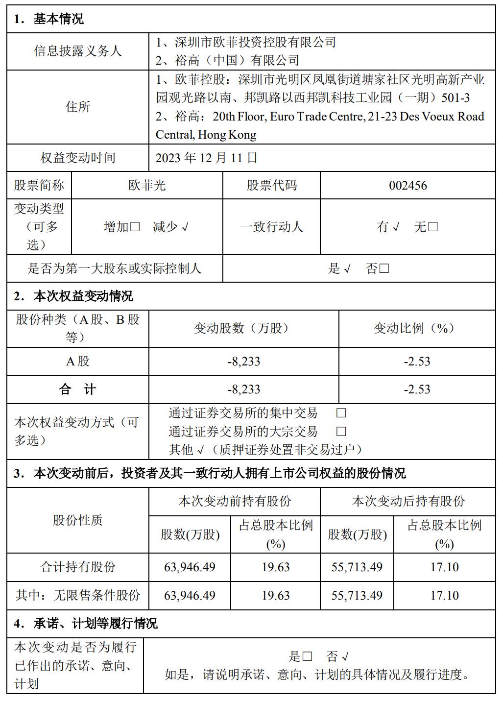本次权益变动后,控股股东深圳市欧菲投资控股有限公司(简称“欧菲控股”)持有公司股份294,573,812股,占公司总股本的9.04%;裕高(中国)有限公司(简称“裕高”)持有公司股份241,301,960股,占公司总股本的7.41%。