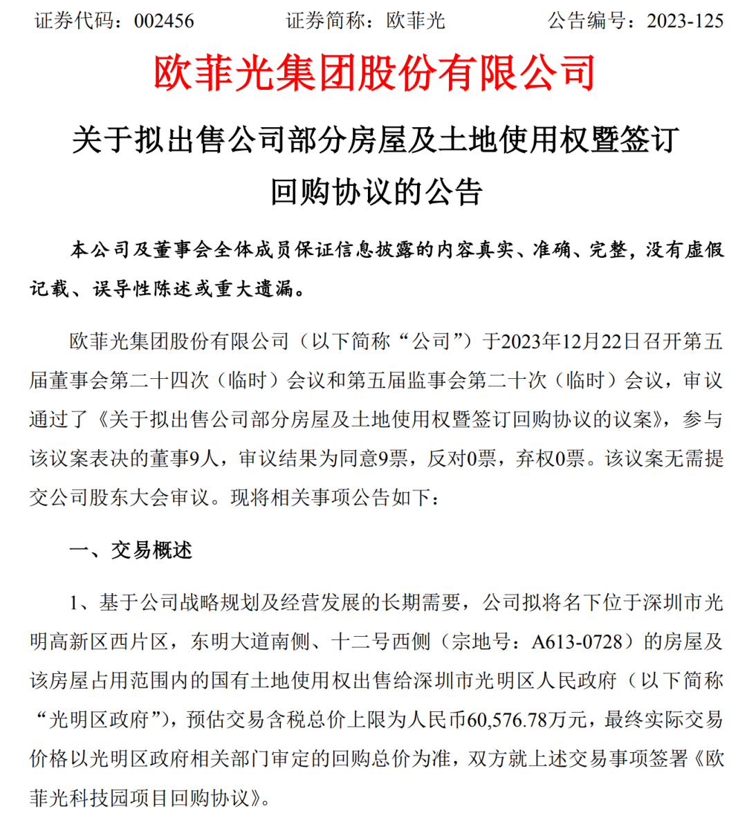 12月25日晚间欧菲光(002456)公告,基于公司战略规划及经营发展的长期需要,拟将名下位于深圳市光明高新区西片区,东明大道南侧、十二号西侧(宗地号:A613-0728)的房屋及该房屋占用范围内的国有土地使用权出售给深圳市光明区人民政府(下称“光明区政府”)。