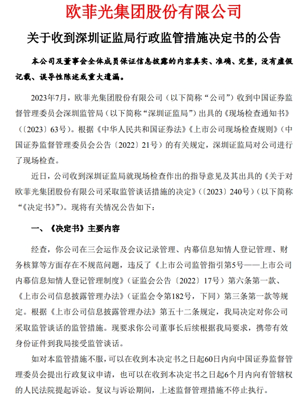 根据相关规定,深圳证监局决定对欧菲光采取监管谈话的监管措施,要求公司董事长后续根据要求,携带有效身份证件接受监管谈话。
