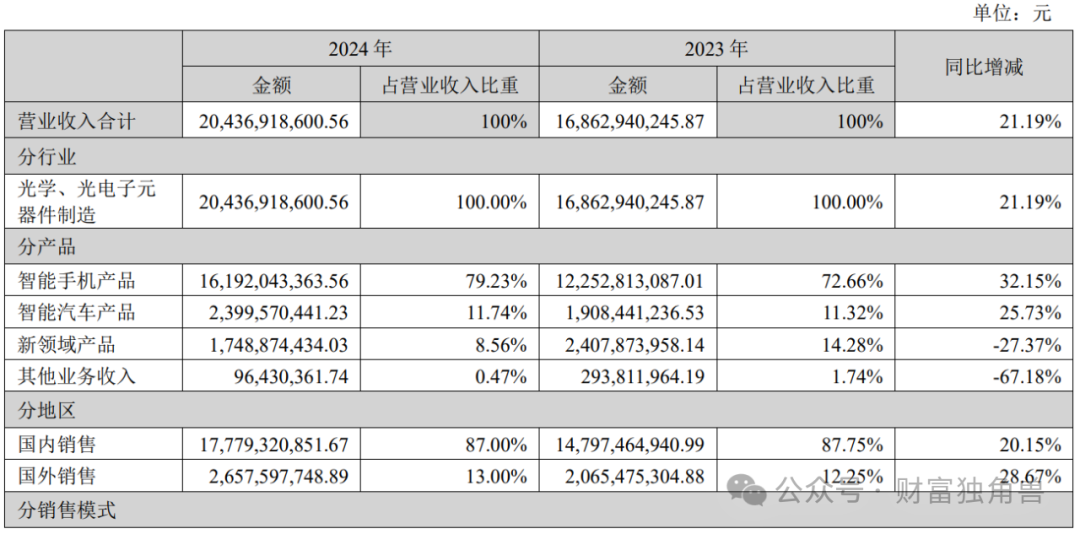 首先是智能手机,2024年实现营收161.92亿元,同比增长32.15%,增长动能来自技术突破及客户黏性强化。具体来看,7P光学镜头、潜望长焦镜头、双群内对焦镜头、可变光圈镜头等高端产品均已成功量产,并进入国内主流手机厂商旗舰项目供应链,驱动单机价值量提升;绑定头部客户华为、小米、OV,高端模组市占率提高。