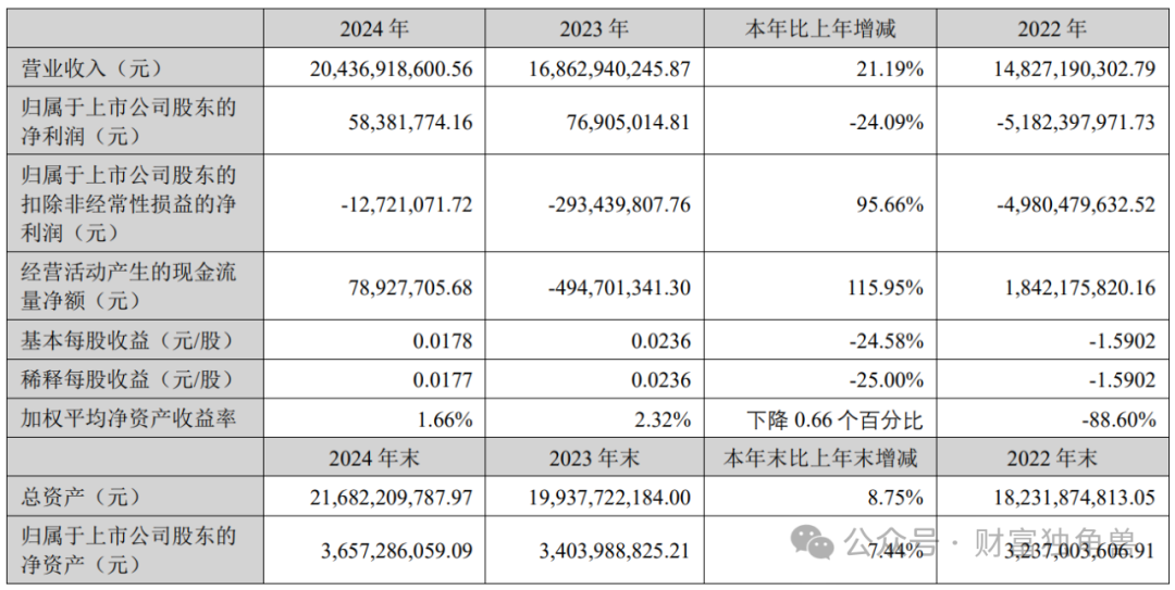 2024年欧菲光实现营业总收入204.37亿元,同比增长21.19%,主要依赖智能手机业务复苏及智能汽车业务放量;然而归母净利润仅0.58亿元,同比下滑24.09%,扣非净利润连续五年亏损,累计未弥补亏损超67亿元。