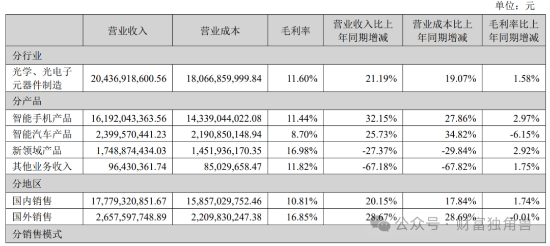 营收增长与盈利恶化的背离:智能手机业务贡献79.23%营收,高端产品渗透带动收入同比增长32.15%,同时毛利率提升2.97个百分点至11.44%;智能汽车业务收入同比增长25.73%,但价格竞争导致毛利率骤降6.15个百分点至8.7%。