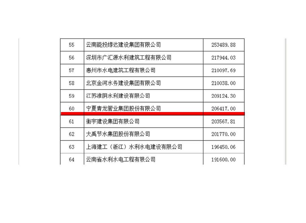 近日,中国水利企业协会公布2020年全国优秀水利企业营收100强、利润总额50强名单,青龙管业集团营业收入位列第60名、利润总额位列第23名。
