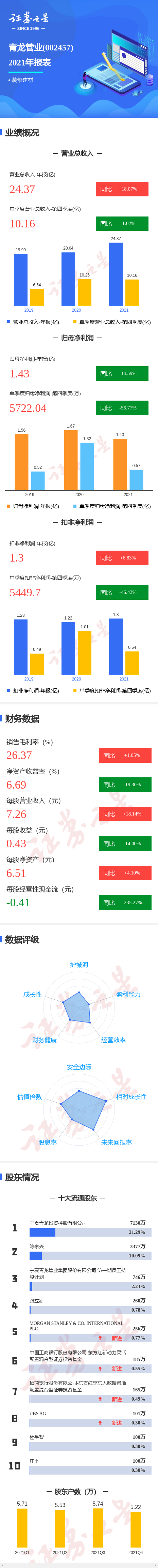 青龙管业2021年报显示,公司主营收入24.37亿元,同比上升18.07%;归母净利润1.43亿元,同比下降14.59%;扣非净利润1.31亿元,同比上升6.83%;其中2021年第四季度,公司单季度主营收入10.16亿元,同比下降1.02%;单季度归母净利润5722.05万元,同比下降56.77%;单季度扣非净利润5449.71万元,同比下降46.43%;负债率41.95%,投资收益902.8万元,财务费用2435.8万元,毛利率26.37%。