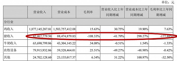 年报显示,尽管猪收入的营收比重仅占2%(鸡收入占90%),营业成本比去年同期增长了近3倍,但营业收入却同比减少42%,毛利率则为-108%,比去年同期大减178%,相当于净亏4600万元。