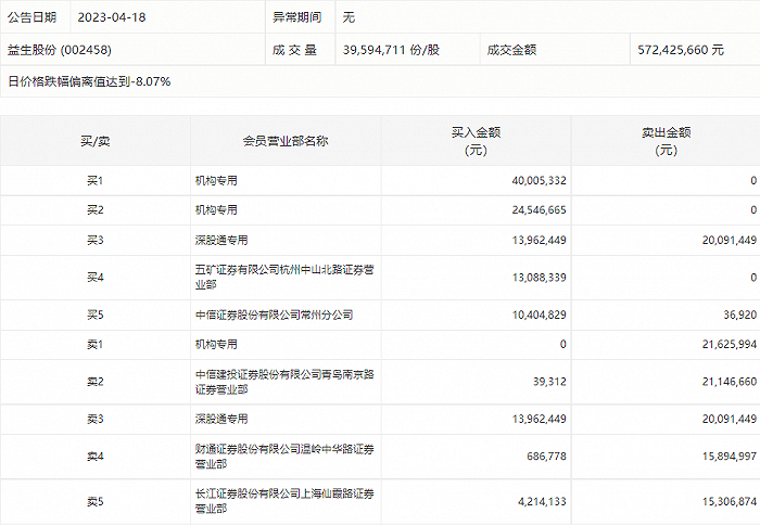 4月18日,益生股份今日跌8.19%,龙虎榜数据显示,上榜营业部席位全天成交2.01亿元,占当日总成交金额比例为35.12%。其中,买入金额为1.07亿元,卖出金额为9410.29万元,合计净买入1284.49万元。