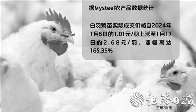 对于近期鸡苗价格快速上涨,国内白羽鸡行业龙头益生股份证券代表李玲对《证券日报》记者表示,一方面,去年12月下旬“停孵期”后,市场鸡苗供应量减少;另一方面,随着毛鸡价格上涨,养殖户补栏积极较高,市场对鸡苗的需求有所提升。供给减少需求增加,导致近期鸡苗价格快速上涨。
