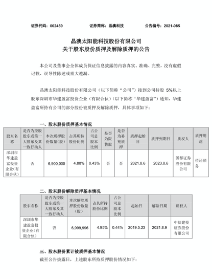 不过,具体原因或能从公司前两日的公告中窥见一斑。8月9日晚,晶澳科技发文称,接公司持股5%以上股东华建盈富通知,华建盈富所持有公司的部分股份被质押及解除质押。