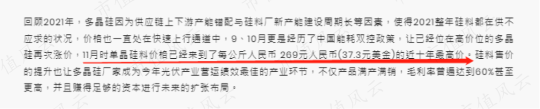 据权威第三方权威咨询机构PV InfoLink统计,2021年硅料供不应求,11月硅料价格达到269元/公斤的十年历史最高价。