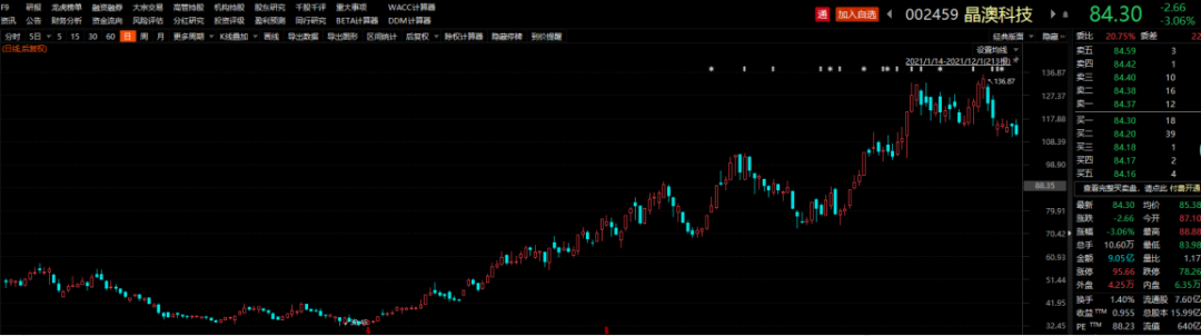 2021年11月29日,晶澳科技(002459.SZ)解除限售股份约1.21亿股,占公司总股本7.57%,解禁股份流通市值约为105亿。上周二开始,这家光伏概念公司股价一周内从101元跌至84元左右。